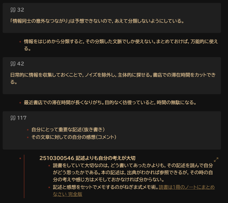 引用ブロックの上部にページ数,その下に感想を記入しています。画像一番下のブロックは,Obsidianに保存されている他ページのリンクプレビューです。